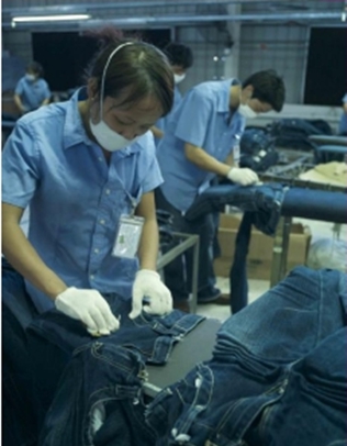 三:臭氧氧化與傳統(tǒng)方法的優(yōu)缺點比較 1. 用次氯酸鈉(婆梅度為18度)經(jīng)濟;不好控制,有傷布的纖維。健康危害:經(jīng)常用手接觸本品的工人,手掌大量出汗,指甲變薄,毛發(fā)脫落。本品有致敏作用。本品放出的氯氣有可能引起中毒。具腐蝕性,可致人體灼傷,具致敏性。 2. 用亞氯酸鈉和硫酸在加次氯酸鈉。價格比上一種高點。但比上一種好點。不傷布的纖維。亞氯酸鈉有強氧化性。在175℃時即分解而發(fā)熱,與可燃物質(zhì)接觸,即起猛烈爆炸,須注意安全。硫酸對環(huán)境有危害,對水體和土壤可造成酸性污染。具強腐蝕性、強刺激性,可致人體灼傷。 3. 高錳酸鉀、過醋酸和還原漂白方式 關于牛仔布漂白,除了用次氯酸鈉和亞氯酸鈉外,還可以用高錳酸鉀、過醋酸和還原漂白方式,具體需要根據(jù)牛仔布所用染料類型來選擇,傳統(tǒng)牛仔為還原淀籃染料,也有用硫化染料或直接染料代替,也有采用活性染料代替的,故此,需要根據(jù)具體情況考慮。 4. 臭氧氧化的優(yōu)點 a) 無污染,臭氧為純凈物。在常溫下,易分解,生成氧氣和氧原子 b) 臭氧的氧化能力極強。 c) 運行成本低 四:手工處理 1.手擦 a) 在洗水前,通過使用砂輪滾動摩擦而使布面染料褪色,手擦的地方通常是脾位和臀位,人為的機械褪色,讓牛褲在洗水后顯得自然地懷舊和泛白 b) 噴沙和手擦效果接近,但對布紋的效果有差別。噴沙后布紋模糊,沉底,而手擦后布紋清晰凸顯