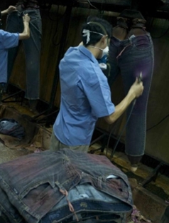 6.噴砂 是在洗水前,通過使用一些表面粗糙的物質(zhì)(如硼砂),通過噴槍在一定的氣壓作用下使沙打擊并摩擦布面而達到褪色的效果,噴砂的地方經(jīng)洗水后顯得較為自然地懷舊和泛白,給人較強隨意感