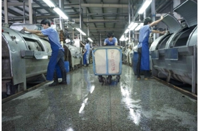 2.石洗 石洗即在洗水中加入磨石或膠球。根據(jù)客戶的不同要求,可以采用黃石、白石、、膠球等進行洗滌。洗后衣服(或織物)在手感上得到較大改善,顏色變淺,起較多絨毛,呈現(xiàn)灰矇矇的效果,衣物及衣衫骨位等地方有明顯磨損現(xiàn)象,整體給人以陳舊感 3.酵洗 酵洗是在洗水中加入酵素的一種洗水方法。酵素實際上為一種纖維素酶,它可以在一定PH和溫度條件下,對纖維結(jié)構產(chǎn)生降解作用,可以與石頭并用或象征性代替石頭,經(jīng)過適當調(diào)整用量處理后,布面于手感方面得到滑爽柔軟的感覺,顏色有輕微褪色,起毛度有較大程度改善,由雜亂長毛變?yōu)檩^規(guī)則短毛或無毛,磨損度相對輕,骨位處有一定效果,衣衫顯的少許陳舊 4.硣石洗 在酵洗中加入石頭,一方面可加強衣物的褪色作用,另一方面也可增強衣物的磨損性,以突出其陳舊感。它于手感、磨損程度、褪色等方面都要較酵素洗夸張,去毛也比酵素洗多,干凈 5.砂洗 多用一些堿性、氧化性助劑所做的一種洗水,它于柔軟劑處理后手感會得到松軟、柔和感,單獨或配以石頭洗水后顏色有較大改變,褪色較多,絨毛短而多,磨損度視處理時間而定,給人以較強的陳舊感。一般來說,紗織物的砂洗效果優(yōu)于線織物,粗支紗優(yōu)于高支紗,低捻度優(yōu)于高捻度,浮點長的優(yōu)于浮點短的產(chǎn)品 6.漂洗 漂洗可分為氧漂和氯漂和髙錳漂: a) 氧漂是利用雙氧水在一定pH和溫度下的氧化作用來破壞染料結(jié)構,從而達到褪色、增白的目的,一般漂后布面會略微泛紅。由于其作用較溫和,因此白色衣物的漂洗多用雙氧水。 b) 氯漂是利用次氯酸鈉的氧化作用來破壞染料結(jié)構,從而達到褪色目的。但由于其作用強烈及氯離子的顯色作用,布料漂后易泛黃,氯漂的褪色效果粗獷,多用于靛蘭牛仔布的漂洗。衣物漂白對板后,應以海波對水中殘余的漂水進行中和,使漂白停止。氯漂對纖維強力損傷較大,加漂白洗滌劑的方向應與轉(zhuǎn)缸方向一致,以避免衣物因與漂白劑直接高濃度接觸,而出現(xiàn)漂白不均的現(xiàn)象。漂洗后的衣物有潔白、鮮艷的外觀和柔軟的手感。由于雙氧水、氯漂水均屬刺激性、強氧化性化學品 7.炒雪花 用一定濃度的氧化劑如漂水,高錳酸鉀浸火山石,然后將火山石取出,在不加水的情況下,與衣物在洗水機中一起轉(zhuǎn)動。由于石頭打磨的不均勻,沾在石頭上的氧化劑與衣物上的染料產(chǎn)生不均勻和不同程度的破壞,結(jié)果在衣物上產(chǎn)生云花的效果,如果在靛藍牛仔上就會產(chǎn)生白色的雪花般的效果。但其它染料如活性染料,由于每種染料同氧化劑發(fā)生的反應不同,所以洗水后表現(xiàn)出來的顏色也不同 8.套色 用一定比例的染料改變衣物原有的顏色,達到合適的色光或者懷舊效果 9.成衣染色 利用不同的染料,將白胚布染成各種不同顏色或效果 染色分為直接染,碧紋染和活性染三種 10.加軟 用一定比例的硅油或軟油改變衣物手感,達到較為柔軟的效果,但衣物色光會有稍微的變化 如果用打冷風的方式也可以達到一定柔軟衣物的效果,效果不是非常明顯,但是不會有色光的區(qū)別 六:特殊效果 1.鐳射激光 鐳射激光在衣物表面做出圖案效果 2.臭氧處理 用臭氧將染料,特別是靛藍氧化,使衣物變黃變黑變深,顯出衣物的檔次 3.防菌處理 抗菌整理是通過抗菌整理劑或納米技術能殺滅霉菌、阻止霉菌的繼續(xù)生存或能在纖維上建立障礙物,以阻止霉菌與纖維直接的化合物。纖維素纖維織物經(jīng)防腐整理后具有抵抗細菌或霉菌侵蝕的性能 4.皮革涂層 用臭氧將染料,特別是靛藍氧化,使衣物變黃變黑變深,顯出衣物的檔次 七:洗水化工料 1.褪漿水 液態(tài)的α-淀粉酶,用做退漿劑。它能夠迅速分解淀粉和其它一些糊料,處理后的織物會有較軟的手感,更好的上染性,可減少后處理中發(fā)生問題的可能性。應用不會影響織物的質(zhì)量,只會由于退漿而使其重量有所減輕。使用溫度一般在60-80℃ 2.浮石 a) 土耳其白石:白石一般有1-2cm及2-3cm兩種。根據(jù)要求達到的摩擦程度的不同而采用不同的石頭。白石的優(yōu)點是消耗小,經(jīng)久耐用,效果較重。 b) 印尼黃石:黃石直徑在1-2 cm及2-3cm兩種。成淺黃色其洗滌效果好,但其損耗較大,一般用于輕涂顏色衣服的水洗打磨。 c) 人造石:由于天然的浮石含有礦物質(zhì)比較多,尤其含鐵較多,因此難以通過驗針機,而一些衣服又要達到石磨特有的效果,這樣可以采用人造石。人造石是通過化學方法加工而成,其顆粒非常均勻,具有損耗小的特點,可達到一般的石磨效果。但價格較貴。 d) 膠球(GREEN BALL、RUBBER BALL):膠球是一種用有機樹脂合成的表面很粗糙的球狀膠體,一般用于較輕度的打磨。因某些客戶要求洗水后衣衫需過驗針機,而石頭顆粒可能含有金屬礦物質(zhì),因而可以用膠球作為石頭的替代品 3.酵素 藥品簡介:DENIMAX BT是一種中性PH值的纖維素酶,較多用于牛仔服裝的“石磨”脫色加工處理上,以獲得陳舊的石洗效果,可與石頭配合使用,能最大程度的減少洗物的返沾染。 PH值范圍:6-8 溫度:50-60℃ 產(chǎn)品無毒,不可燃 4.消毛水 藥品簡介CELLUSOFT L是一種由非病原菌的微菌在水中發(fā)酵而成的液體纖維素。可用于纖維素織物的光潔整理,對全棉織物,棉/混紡,亞麻和苧麻及其它纖維素纖維的機織或針織都適用。經(jīn