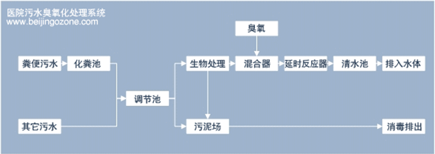 近來發(fā)展起來的臭氧水處理技術(shù),在醫(yī)院污水處理工程上被廣泛應(yīng)用,收到了極好的效果,這是因?yàn)槌粞醣嚷取⑵追邸⒍趸染哂懈鼜?qiáng)的氧化能力,可以比氯快600-3000倍的速度殺死包括氯不能徹底殺死的所有細(xì)菌、病毒等;可將某些重金屬離子Pb、Hg等氧化沉淀達(dá)到分離的目的;另外臭氧還可降低生化耗氧量(BOD)和化學(xué)耗氧量(COD)、去除亞硝酸鹽和脫色、除臭等。經(jīng)此處理的醫(yī)院污水,可大大提高排放標(biāo)準(zhǔn),甚至可返回作為非飲用水使用。 工藝流程簡介 整個工藝可分兩級處理,如圖所示。 B.二級處理